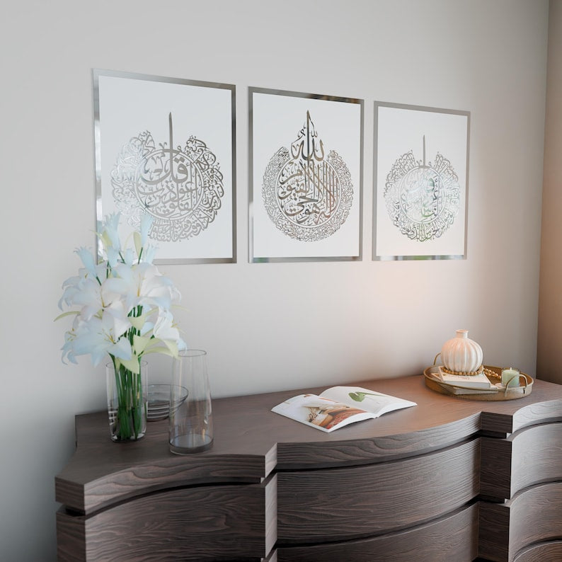 Enhance your home with spiritual beauty and timeless elegance through this Islamic Wall Art Set featuring Ayatul Kursi, Surah Al-Falaq, and Surah An-Nas. Designed to inspire faith and tranquility, this set combines meaningful Quranic verses with modern artistic presentation, making it a perfect addition to any living space.