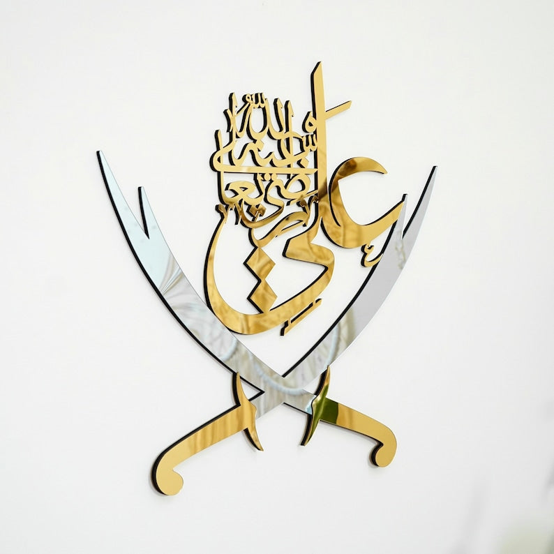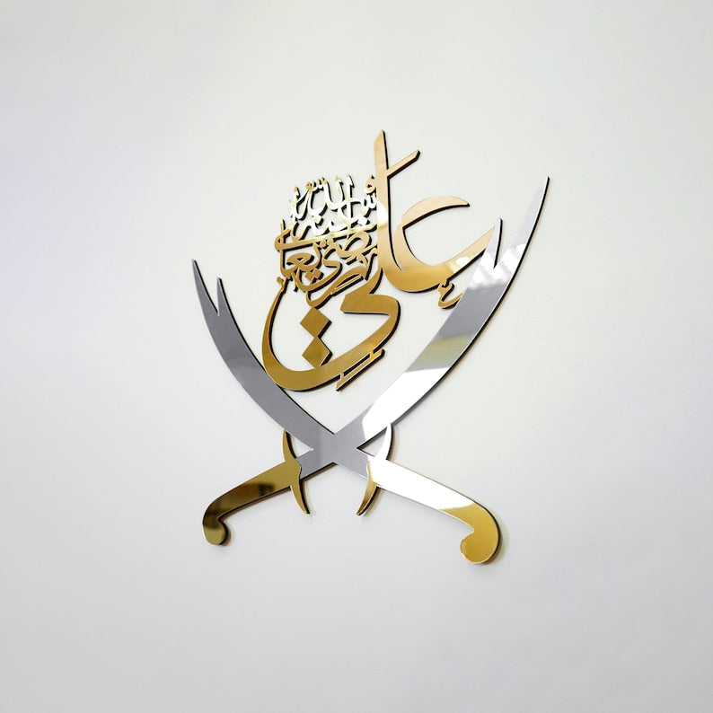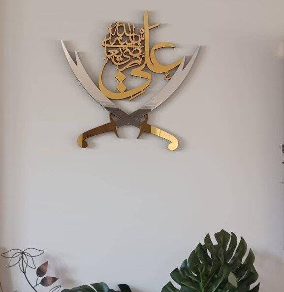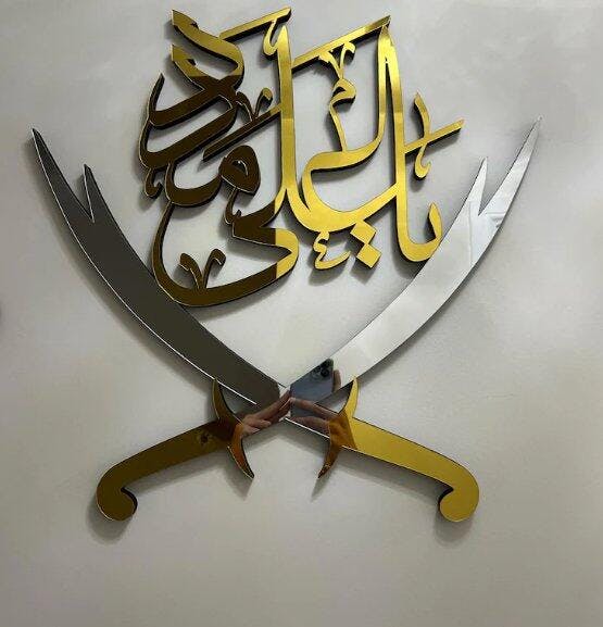 ✅ Design: Striking silhouette of Zulfiqar with Imam Ali’s name in elegant Arabic script